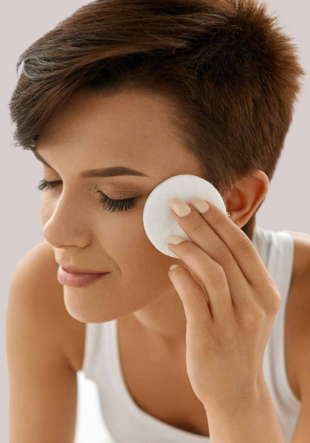 洁面后,用化妆棉蘸取化妆水,擦拭面部、颈部和肩部。